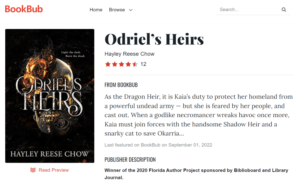 - Awards: Odriel’s Heir was the winner of the 2020 Florida Indie Author Project (which is free to enter and I highly recommend) and a finalist in the 2021 Book Blogger Novel of the Year Award (which is $20 to enter and I also highly recommend). That’s stated both on my the book page itself, and I put it in the comments of my BookBub application.