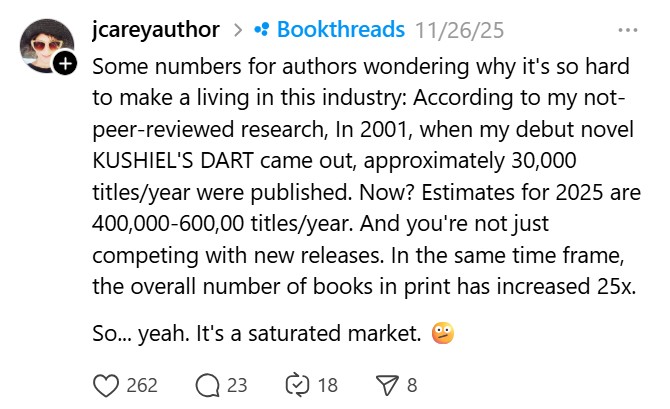 To give you an idea of how the bookish landscape has changed in the past two decades (and this was largely before the added gen A.I. issue), here’s a post by NYT best-selling author, Jacqueline Cary, that also underscored the naturally increasing difficulty of creative visibility:
