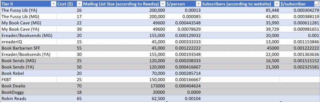 Selecting the promo newsletters is a little tricky, but there are some good articles to help you decide like these lists from This is Writing, Nicholas Erik, and Reedsy. I mostly used the Reedsy stats to come up with the excel sheet below (which may be outdated) to help me decide. The ones I used for Gatekeeper were: Freebooksy, EreaderNews, Fussy Librarian, Free Kindle Books & Tips, and My Book Cave. I would’ve used Booksends/Bookrunes, but I didn’t send the request in early enough, and of course while I would LOVE to get a Bookbub deal, this generally requires getting some reviews under your belt first and going wide, so I’m still trying to get there!