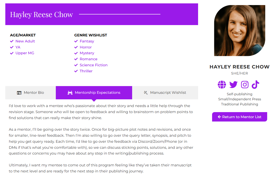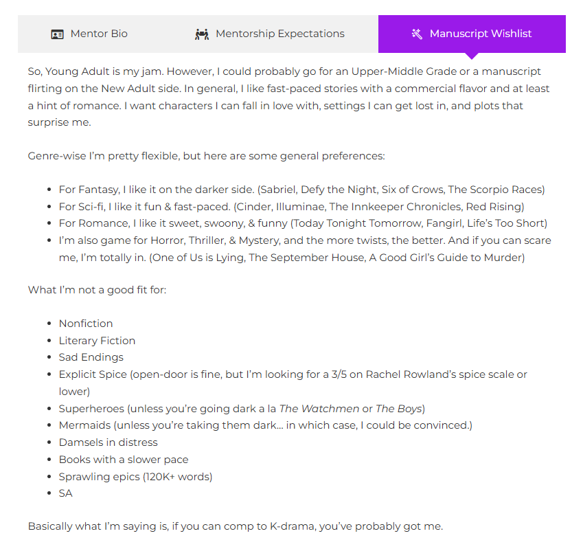 Basically, you submit your query, manuscript, & synopsis, and if you get picked up by a mentor, you’re essentially getting a free critique/edit of your manuscript from someone who’s been in the publishing world for some time.