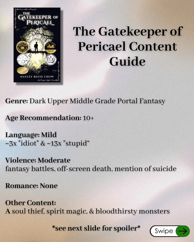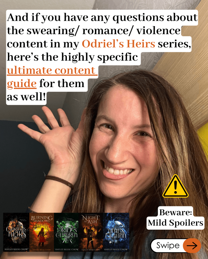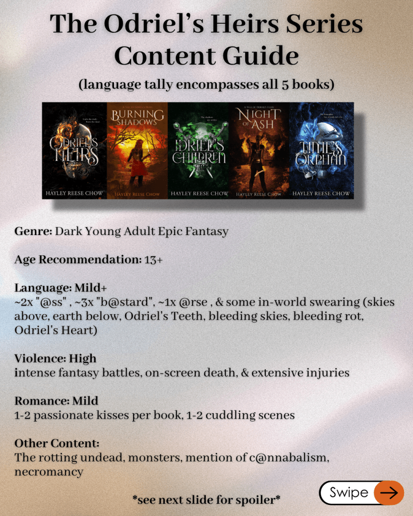 This post is specifically about my Odriel’s Heirs series, but you can find the content guide for my Into the Churn series here and my upper-middle-grade stand-alone, The Gatekeeper of Pericael is coming next week. Thanks for reading!